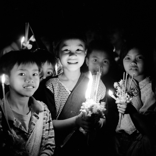 At Vat That Luang, children participate with joy in the circumambulation of the sacred Stupa, on the evening of the Makha Busaa night, carrying an offering to the Triple Gem: the Buddha; the Dhamma; the Sangha. Archive No. 355-12