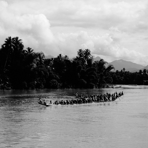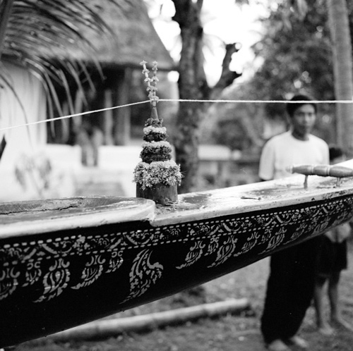 A simple flower offering graces the bow of a long boat in preparation for the anual boat races held in Luang Prabang during the middle of the Buddhist Lent retreats. Archieve No. 122-07
