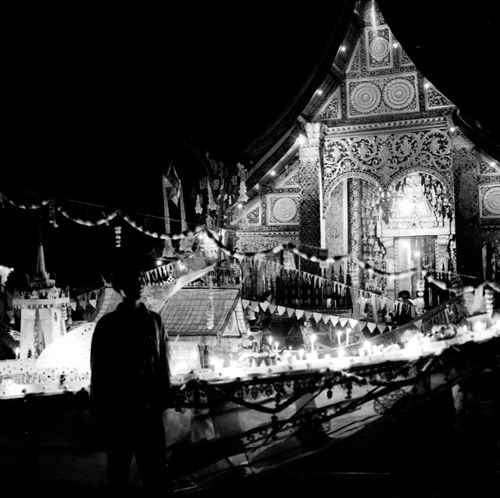 A decorated and lit "Fire Boat" sits in front of Vat Xiang Thong in preparation for the important ceremony to mark the end of Buddhist Lent. During this ceremony thousands of people launch candle lit boats of all sizes onto the Mekong River, sending off the detritus of the last year. Archive No. 275-11.