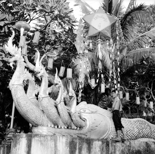 A young man surveys his handiwork in decorations on a Naga staircase to celebrate the end of Buddhist Lent. The Lao inscription on the star reads, "Thank you for looking here". Archive No. 320-01