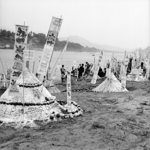 As part of the Lao (Buddhist) New Year celebrations, hundreds of people construct elaborate and decorated sand stupas on the sand bars in the Mekong River. These eventually wash away with the coming of the rainy season. Archive No. 495-04