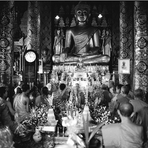 The Exhibition on Vipassana Meditation at Vat Suvannakhili is a blend of historic images drawn from the Buddhist Archives of Photography, and a series of photographer made during Hans Georg Berger's epic project in the 1990's to document Luang Prabang's unique ceremonies. Here the Abbot of Wat Saen Soukhaham leads the evening chanting and meditation. Archive No. 291-07