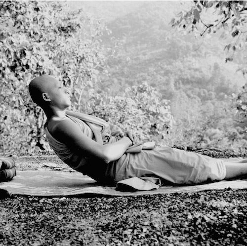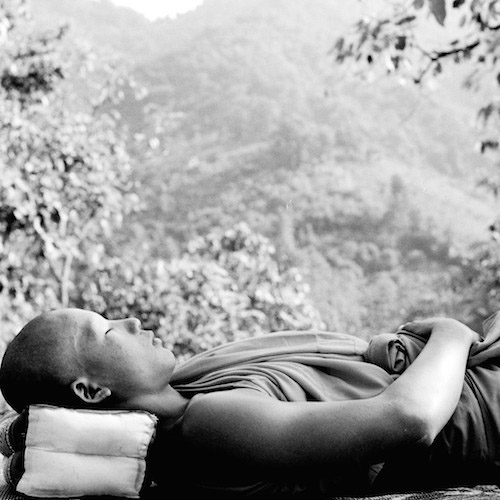 In this and the following two photographs a novice elaborates the slow, measured and highly disciplined movements necessary to achieve the correct posture for a prone, lying down Meditation position. Archive No. 3773-01